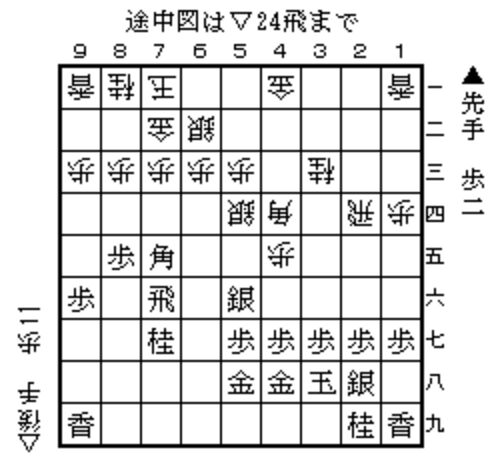 西村一義九段vs内藤国雄九段 第23期王座戦トーナメント 後手は先手からの7筋突破の猛攻をあびるも、玉のコビンの垂歩(46歩)を活かした寄せで決める。 ▲84歩 ▽同歩 ▲同角 ▽46歩 ▲同歩 ▽45歩 ▲82歩 ▽同金 ▲83歩 ▽同金▲95角 ▽46歩 ▲84歩 ▽…